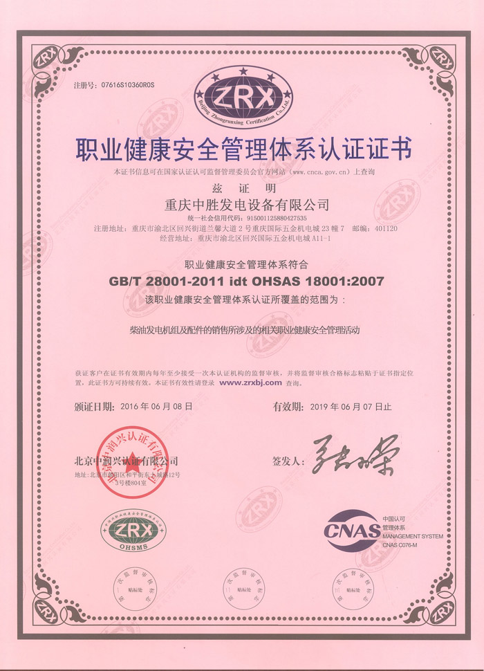 職業健康安全管理體系認證證書