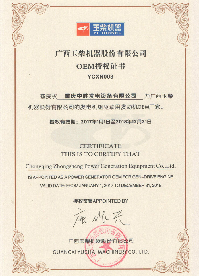 廣西玉柴授權證書